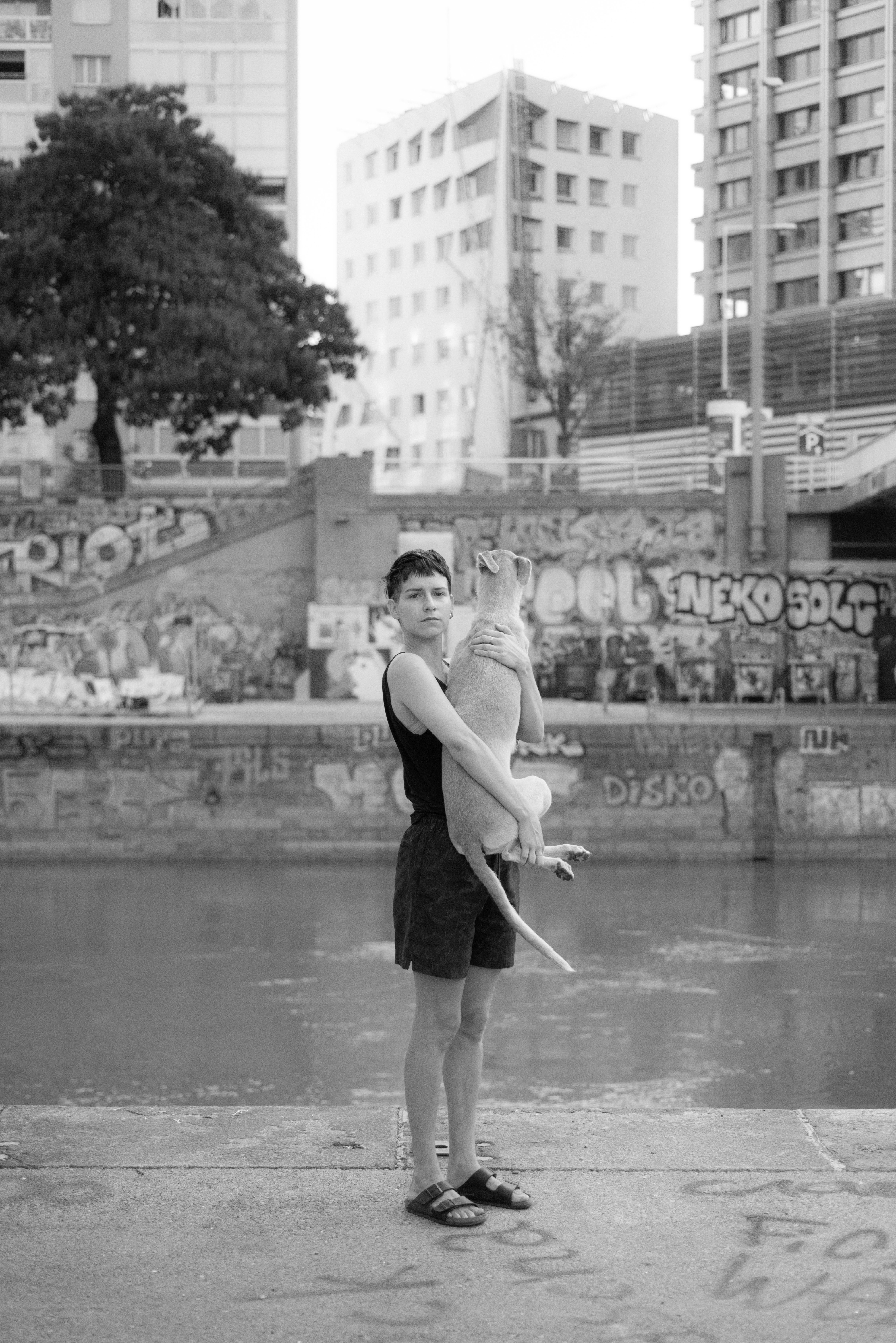 We walk along a stream of water without getting close to it. The canal runs through the city, the water it contains unruffled and tamed. Left and right of it walkways similar to streets, even grey glimmering in the midday sun. I touch the ground with one whole hand and start to count One – Two – Three – Four – Five – Six – Seven and stop. If I can count this far with my skin on the street, it is safe for the dog’s paws, too. We continue our walk next to others by foot or by bike, most of them moving faster than us. Between them, the dog runs without a leash. From time to time, I ask the dog to come closer to me again. Suspicious of the excited sniffs of the dog and human’s ideas, I fear there might be pizza or rat poison hidden in the occasional patches of greenery. The dog’s nose now follows something invisible to my eyes, the black of the nose in a zigzag in the middle of the grey of the street. Suddenly, the movement stops; the dog looks up, squats down, and pees. Now, I see something too: multiple lines running towards my feet, the grey darkening underneath the liquid. I step aside and think I also need to pee. I know I will need to cross the canal to access a public toilet, and I know it smells like pee under the next bridge. I also know the pee there is not from a body like mine or a body like the dog’s.